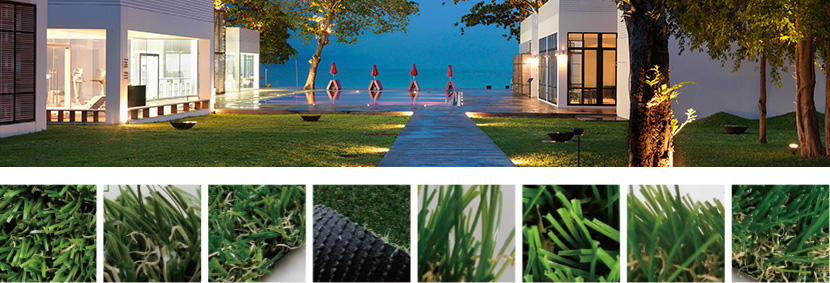 草面纖維分順草和逆草,順草是尼龍66,逆草為較粗硬的PP,兩種草系逼真模仿了天然草地。